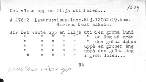 //// ^ Det växte upp en lilja uti dalen... //// A 476:2 Lazarusvisan.insp.Rtj.12062:19.kom. //// Skriven text saknas. //// < //// Jfr Det växte upp en lilja uti den gröna lund //// " " " " " " en äng så grön //// " " " " " " den gröna dalen //// " " " " " uppå en gröner äng //// " " " " " uppå den gröna äng //// " " " " " i grön dalen... //// , , ^ RA ////