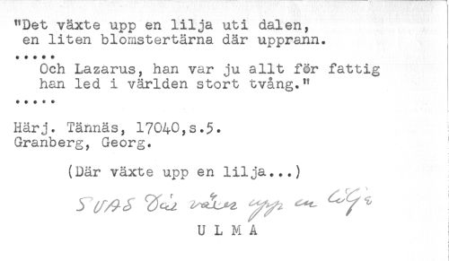 //// "Det växte upp en lilja uti dalen, //// en liten blomstertärna där upprann. //// ***** //// Och Lazarus, han var ju allt för fattig //// han led i världen stort tvång." //// Härj. Tännäs, 17040,s.5. //// Granberg, Georg. //// (Där växte upp en lilja...) //// U L M A //// ! //// : //// j ////