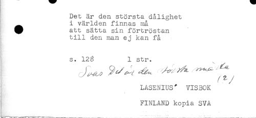 //// Det är den största dålighet //// i världen finnas må //// ^ att sätta sin förtröstan //// till den man ej kan få //// s. 12g 1 str. //// / 2 //// LASENIUS" VISBOK //// < //// FINLAND kopia SVA ////