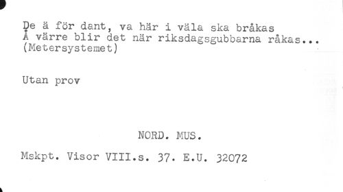 //// De ä för dant, va här i väla ska bråkas //// A värre blir det när riksdagsgubbarna råkas... //// ^Metersystemet) //// Utan prov //// ;; 1 //// NORD. MUS. //// Mskpt. Visor VIII.s. 37. E.U. 32072 ////