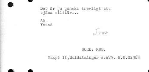 //// Det är ju ganska trevligt att //// tjäna militär... //// Sk //// Ystad //// I //// NORD. MUS. //// Mskpt II,Soldatsånger s.475. E.U.22363 ////