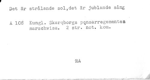 //// Det är strålande sol,det är jublande sång //// A 106 Kungl. Skarqborgs pqnsarregementea //// marschvisa. 2 str. not. kom. //// RA ////
