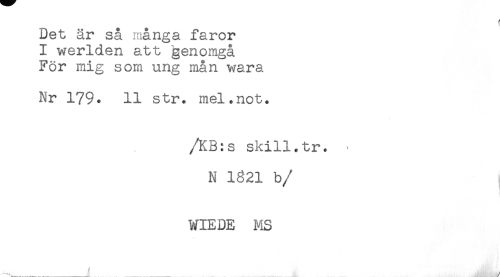 //// Det är så många faror //// I werlden att genomgå //// För mig som ung mån wara //// Nr 179. 11 str. mel.not. //// /KB:s skill.tr. ^ //// N 1821 b //// /WIEDE MS ////