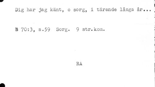 //// Dig har jag känt, o sorg, i tärande långa år... //// * //// - //// t //// . ! //// ) //// B 70:3, s.59 Sorg. 9 str.kom. ! //// ) //// < //// I //// RÅ ////