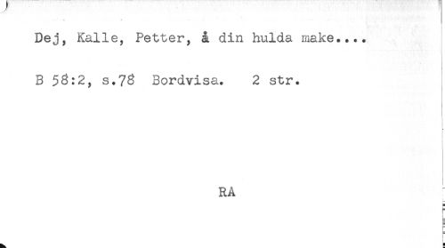 //// Dej, Kalle, Petter, å din hulda make.... //// * //// B 58:2, s.78 Bordvisa. 2 str. //// 1 //// t //// ! //// I //// RA //// 1 //// ! //// ^ b ////