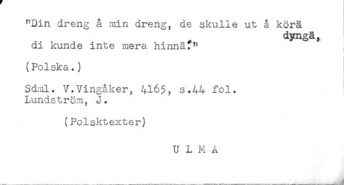 //// ^Din dreng å min dreng, de skulle ut å körä //// dyngä, //// di kunde inte mera hinnä*" //// ! //// i //// (Polska.) //// Sdml< V.Vingåker, 416$, s.44 fol. //// Lundström, J. //// s //// (Polsktexter) //// __ _ . . .. ____ . _ . . _ ////