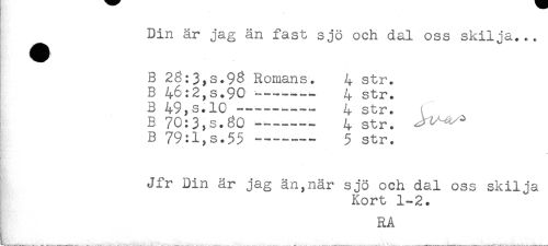 //// B 28:3,s.98 Romans. 4 str. //// B 46:2,s.90 ----4 str. //// B 49,s.l0 -----4 str. //// B 70:3,s.80----4 str. ^ //// B 79:1,s.55----5 str. //// Jfr Din är jag än,när sjö och dal oss skilja //// Kort 1-2. //// RA ////