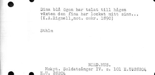 //// Dina blå ögon har talat till hågen //// växten den fina har lockat mitt sinn... //// (K.A.Rignell,not. omkr. 1890) //// Sthlm //// NCRD.MUS. //// Mskpt. ^Soldatsånger IV. s. 101 E.U§28204 ////