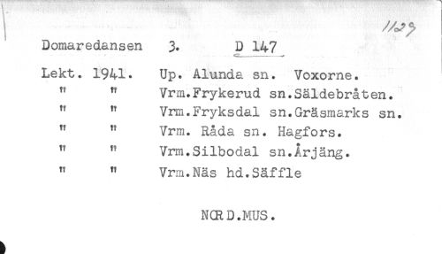 //// I ^ //// Domaredansen 3. D 147 //// Lekt. 1941. Up. Alunda sn. Voxorne. //// " " Vrm.Frykerud sn.Säldebråten. //// " " Vrm.Fryksdal sn.Gräsmarks sn. //// " " Vrm. Råda sn. Hagfors. //// " " Vrm.Silbodal sn.Årjäng. //// " " Vrm.Näs hd.Säffle //// N(RD.MUS. ////