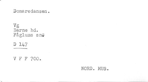 //// Domaredansen. //// Vg //// Barne hd. //// Fåglums sn$ //// D 147 //// V F F 700. //// NORD. MUS. ////