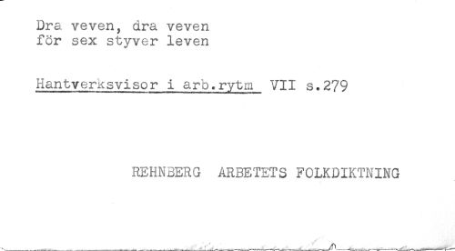 //// Dra veven, dra veven //// för sex styver leven //// Hantverksvisor i arb.rytm VII s.2?9 //// REHNBERG ARBETETS FOLKDIKTNING ////