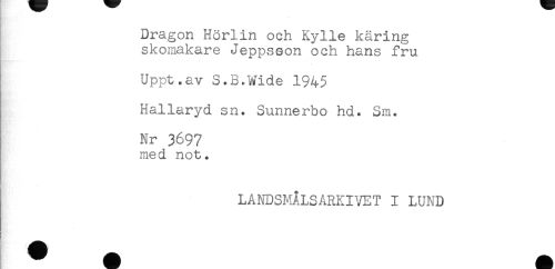 //// Dragon Hörlin och Kylle käring //// skomakare Jeppseon och hans fru //// Uppt.av S.B.Wide 1945 //// Hallaryd sn. Sunnerbo hd. Sm. //// Nr 3697 //// med not. //// Hk' //// LANDSMÅLSARKIVET I LUND ////