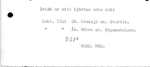 //// Drick ur mitt hjärtas söta skål //// Lekt. 1941 Gä. Ovansjö sn. Storvik. //// t!' //// A //// " " Ån. Nätra sn. Köpmanholmen. //// NORD. MUS. //// t ////