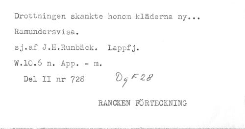 //// Drottningen skänkte honom kläderna ny... //// Ramunde rsvi sa. //// sj.af J.H.Runbäck. Lappfj. //// W.10.6 n. App. - m. //// Del II nr 726 Z)^ //// RANCKEN FÖRTECKNING ////