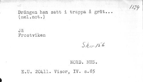//// /X7? //// Drängen han satt i trappa å grät... //// (mel.not.) //// Jä //// Frostviken //// /A Y //// NORD. MUS. //// v //// E.U. 20411. Visor, IV. s.35 ////