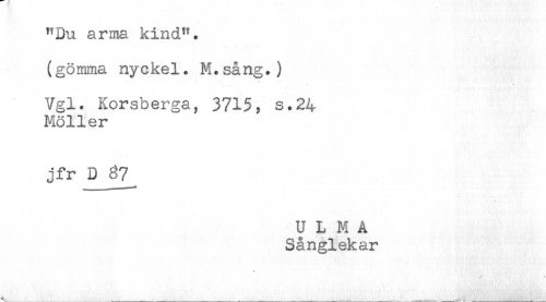 //// "Du arma kind", //// (gömma nyckel. M.sång.) //// Vgl. Korsberga, 3715, s.24 //// Möller //// jfr D_87_ //// U L M Å //// Sånglekar //// A ___ _____ .... ////