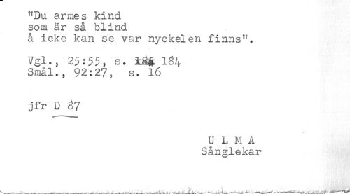 //// "Du armes kind //// som är så blind //// å icke kan se var nyckelen finns". //// Vgl., 25:55, s. 134 //// Smål., 92:27, s. 16 //// jfr D 37 //// U L M A //// Sånglekar ////