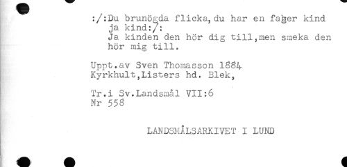 //// :/:Du brunögda flicka, du har en fajger kind //// ja kind:/: //// Ja kinden den hör dig till,men smeka den //// hör mig till. //// Uppt.av Sven Thomasson 1334 //// Kyrkhult,Listers hd* Blek, //// Tr.i Sv.Landsmål VII:6 //// Nr 553 //// LANDSMÅLSARKIVET I LUND ////
