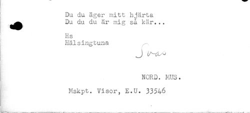 //// Du du äger mitt hjärta //// ^^ Du du du är mig sä kär. .. //// Hs //// Hälsingtuna //// J //// ! //// NORD. MUS. //// Mskpt. Visor, E.U. 33546 ////