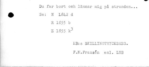 //// Du far bort och lämnar mig på stranden... //// ^ Se: N L842 d //// R 1855 b //// E 1855 k3 //// KB:s SKILLINGTRYCKSREG. //// F.M.Franzén enl. LUB ////
