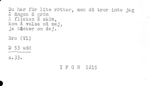 //// Du har för lite rötter, men dä tror inte jag //// å ängen ä grön //// å flickan ä skön, //// kom å valsa mä mej, //// ja täcker om dej. //// Bro (VI) //// D 53 udd //// s.33* //// I F G H 1215 ////
