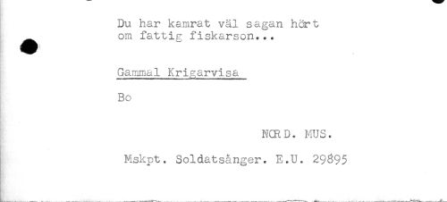 //// Du har kamrat väl sagan hört //// om fattig fiskarson... //// Gammal Krigarvisa //// I ....^... //// Bo //// * //// NCRD. MUS. //// Mskpt. Soldatsånger. E.U. 29695 ////