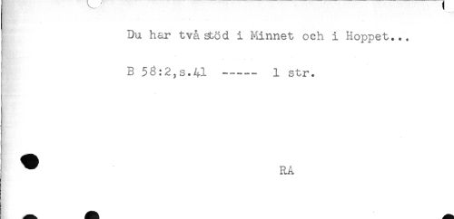 //// Du har tvåsböd i Minnet och i Hoppet... //// B 58:2,s.41 ----- 1 str. //// ^ RA ////