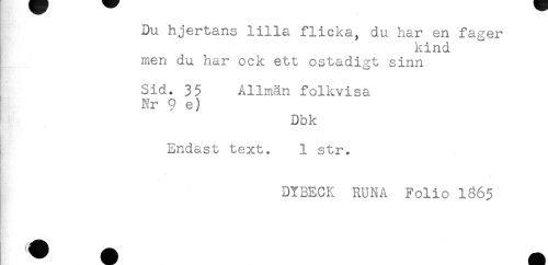 //// Du hjertans lilla flicka, du har en fager //// kind //// men du har ock ett ostadigt sinn //// Sid. 3 5 Allmän folkvisa //// Nr Q e) //// Dbk //// Endast text. 1 str. //// . //// . //// DYBECK RUNA Folio 1865 ////
