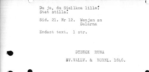 //// Du ja, du Siellkoa lillat //// Stat stillad //// Sid. 21. Nr 12. Wenjan sn //// Dalarna //// . //// Endast text. 1 str. //// DYBECK RUNA //// äV.VALLV. & HORNL. IS46. ////