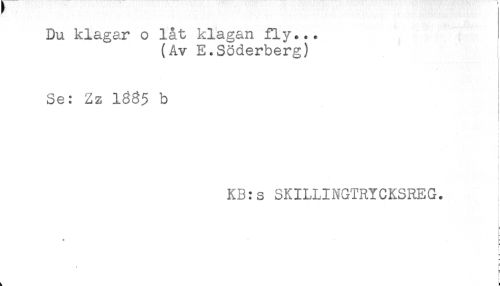 //// Du klagar o låt klagan fly... //// (Av E.Söderberg) //// Se: Zz 1385 b //// i //// i //// t //// t //// t //// i //// i //// KB:s SKILLINGTRYCKSREG. //// ! //// * //// i //// E //// - ////