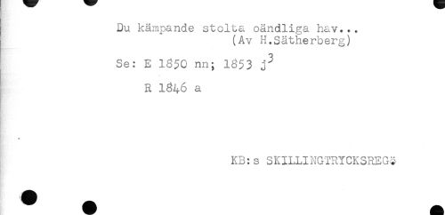 //// Du kämpande stolta oändliga hav... //// (Av H.Sätherberg) //// Se: E 1850 nn; 1853 J^ //// R 1646 a //// KB:s SKILLINGTRYCKSREG^ ////