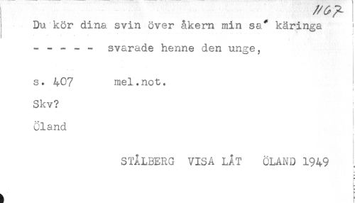 //// Du kör dina svin över åkern min sa* käringa ; //// ----- svarade henne den unge, //// s. 407 mel.not, i //// i //// Skv? //// Oland //// 1* //// STÅLBERG VISA LÅT ÖLAND 1949 ////