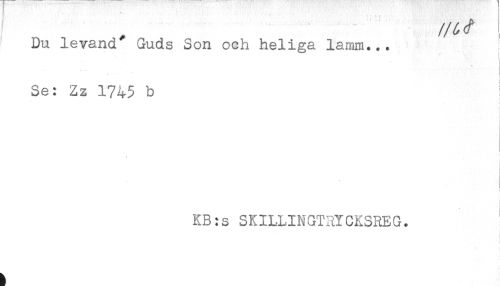 //// Du levand Guds Son och heliga lamm... //// Se: Zz 1745 b ! //// t //// j //// KB:s SKILLINGTRYCKSREG. ////
