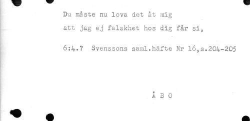 //// Du måste nu lova det åt mig //// att jag ej falskhet hos dig får si, //// * //// 6:4.? Svenssons saml.häfte Nr lo,s.204-205 //// ÅBO //// - ////