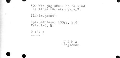 //// "Du och jag skall bo på vind //// så långe kärleken varar". //// (Lekfragment). //// Upl. Järlåsa, 10099, s.3 //// Palmblad, W. //// D 137 ? //// U L M Å //// Sånglekar ////