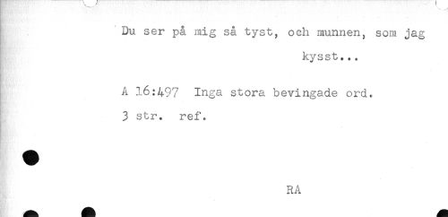 //// * - --.*.. //// Du ser på mig så tyst, och munnen, som jag //// kysst... //// - //// A 16:497 Inga stora bevingade ord, //// 3 str. ref. //// RA ////