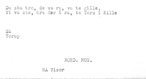 //// Du ska tro, de va ro, va te gille, //// Vi va sta, tre dg?r å ra, te Tors i Kille //// Sk //// Torup //// NORD. MUS. //// HA Visor ////