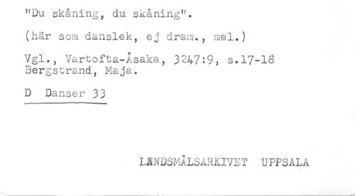 //// "Du skåning, du skåning". //// (här som danslek, ej dram., mel.) //// Vgl., Vartofta-Asaka, 3247^9, s.17-16 //// Bergstrand, Maja. //// D Danser 33 //// LåNDSMALSARKIVET UPPSALA ////