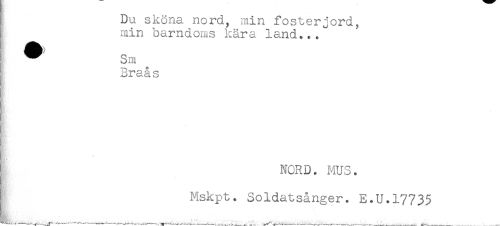 //// } Du sköna nord, min fosterjord, //// ; min barndoms kära land..." //// Sm //// } Braås //// : //// { NORD. MUS. //// ! Mskpt. Soldatsånger. E.U.17735 ////