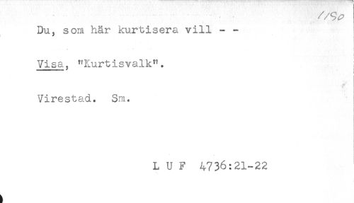//// Du. som här kurtisera vill - - //// J //// - //// < //// Visa, "Kurtisvalk". //// ....- ^ //// ! //// Virestad. Sm. //// * //// L U F 4736:21-22 ////