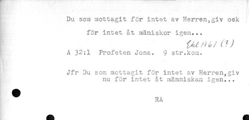 //// , - . . - j //// Du som mottagit for intet av Herren,giv ock //// t', - "' - - - .....- - - . //// för intet åt mäniskor igen... //// A 32:1 Profeten Jona. 9 str.kom. //// . //// Jfr Du som mottagit för intet av Herren,giv //// nu för intet åt människan igen... //// ^ RA ////