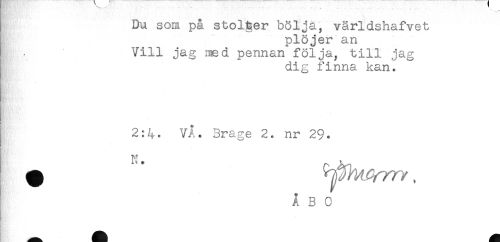 //// Du som på stolger bölja, världshafvet //// plöjer an //// Vill jag rsed pennan följa, till jag //// dig finna kan. //// s //// 2:4* VÅ. Brage 2. nr 29. //// N. //// ÅBO //// _ ^^ ^ ////