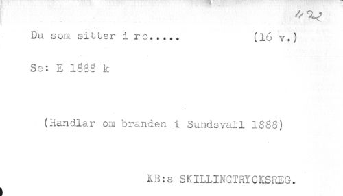 //// Du som sitter i ro*.... (16 v.) //// Se: E Iggg k //// (Handlar om branden i Sundsvall lggg) //// K3:s SKILLINGTRYCKSREG. ////