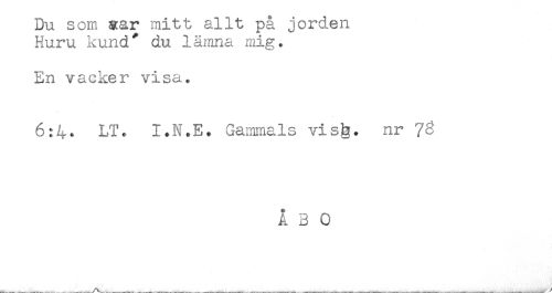 //// Du som aar mitt allt pa jorden //// Huru kund' du lämna mig. //// En vacker visa. //// 6:4. LT< I.N.E. Gammals visig. nr 7^ //// ÅBO ////