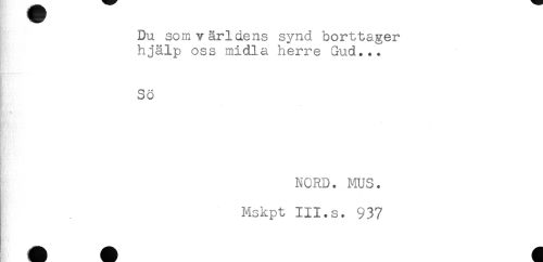 //// Du som världens synd borttager //// hjälp oss midla herre Gud... //// Sö //// < //// Hr ' //// NORD. MUS. //// Mskpt III.s. 937 ////