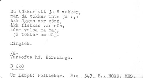 //// Du tökker att ja ä vakker, //// män dä tökker inte ja :, : //// Akk äggen var göm, //// åkk flekkan var sön, //// kåmm valsa mä mäj, //// ja tökker um däj. //// Ringlek. //// Vg. //// Vartofta hd. Korsbärga. //// D 220 //// Ur Lampa: Folklekar. N:o_ 34JL B..^NORD. MUS. ////
