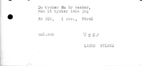 //// Du tycker du är vacker, //// Men så tycker icke jag //// < //// A .. ... //// ^ Nr 292, 1 str., Pärnå //// t //// mel.not g ^ ^ //// i LAGUS NYLAND //// j //// < //// f ////