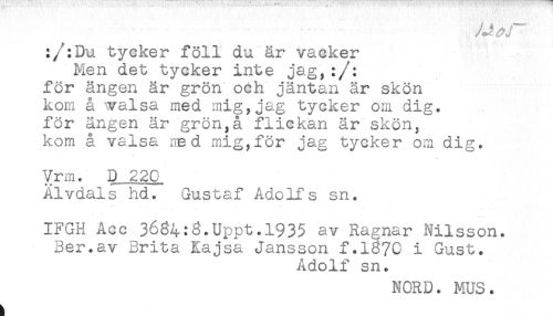 //// .. . r . /J^ I //// :/:Du tycker föll du år vacker //// Men det tycker inte jag,:/: //// för ängen är grön och jäntan är skön //// kom å walsa med mig,jag tycker om dig. //// för ängen är grön,å flickan är skön, //// kom å valsa med mig,för jag tycker om dig. //// Vrm. D 220 //// Älvdals hd. Gustaf Adolfs sn. //// IFGH Acc 3684:3*Uppt.l935 av Ragnar Nilsson. //// Ber.av Brita Kajsa Jansson f.l87C i Gust. //// Adolf sn. //// NORD. MUS. ////