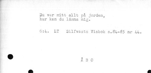 //// -- - - <r t- f- '. * //// ^ Du var mitt allt på jorden, //// hur kan du lämna mig. //// * //// 6:4. LT Silfvasts Visbok s.84-35 nr 44. //// ^ ÅBO ////