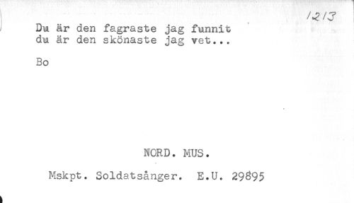 //// Du är den fagraste jag funnit //// du är den skönaste jag vet... //// Bo //// NORD. MUS. //// //// /Mskpt. Soldatsånger. E.U. 29^95 ////
